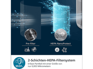 - Filtersystem: HEPA-Filter + Vorfilter (zwei Stufen zur Reduktion von Feinstaub, Pollen und Allergenen)
