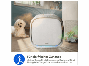 Der PHILIPS AC3360/11 PureProtect Pet 3000 Series in Seidenweiß ist ein auf Haustierhaushalte zugeschnittener Luftreiniger, der Räume bis zu 104 m² effektiv von Partikeln, Allergenen und Gerüchen befreien kann.