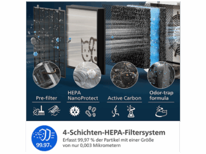 - Filtertechnologie: HEPA NanoProtect gemeinsam mit Vorfilter und Aktivkohlefilter – entfernt Feinstaub, Pollen, Tierhaare/-dander und Gerüche.
